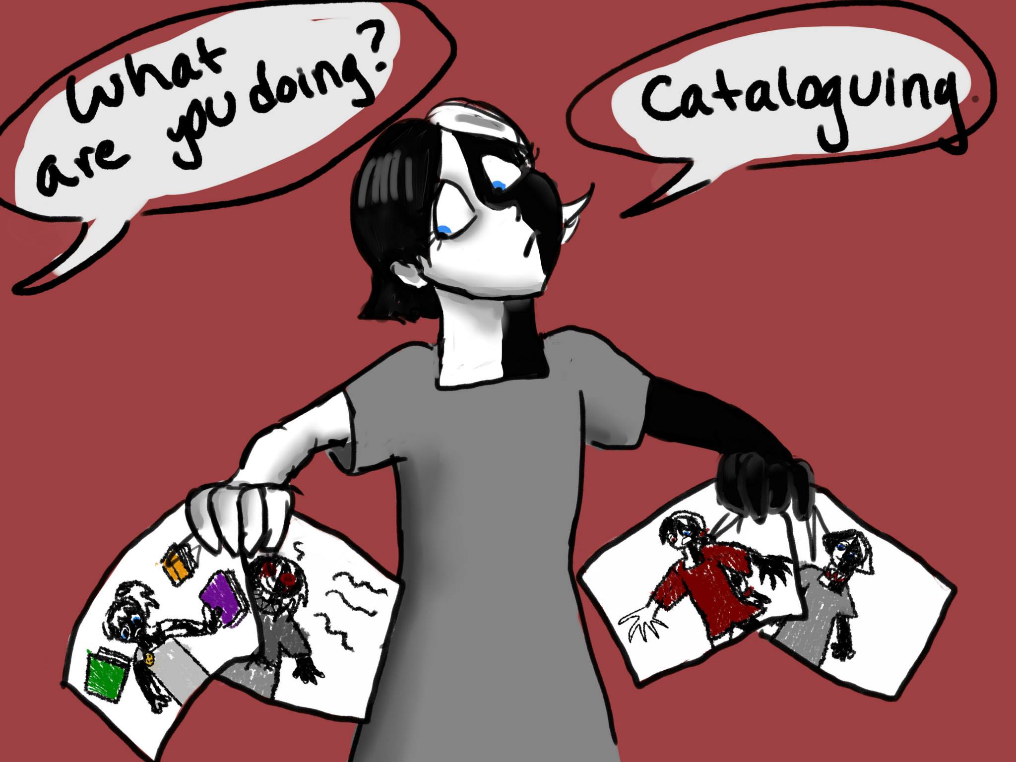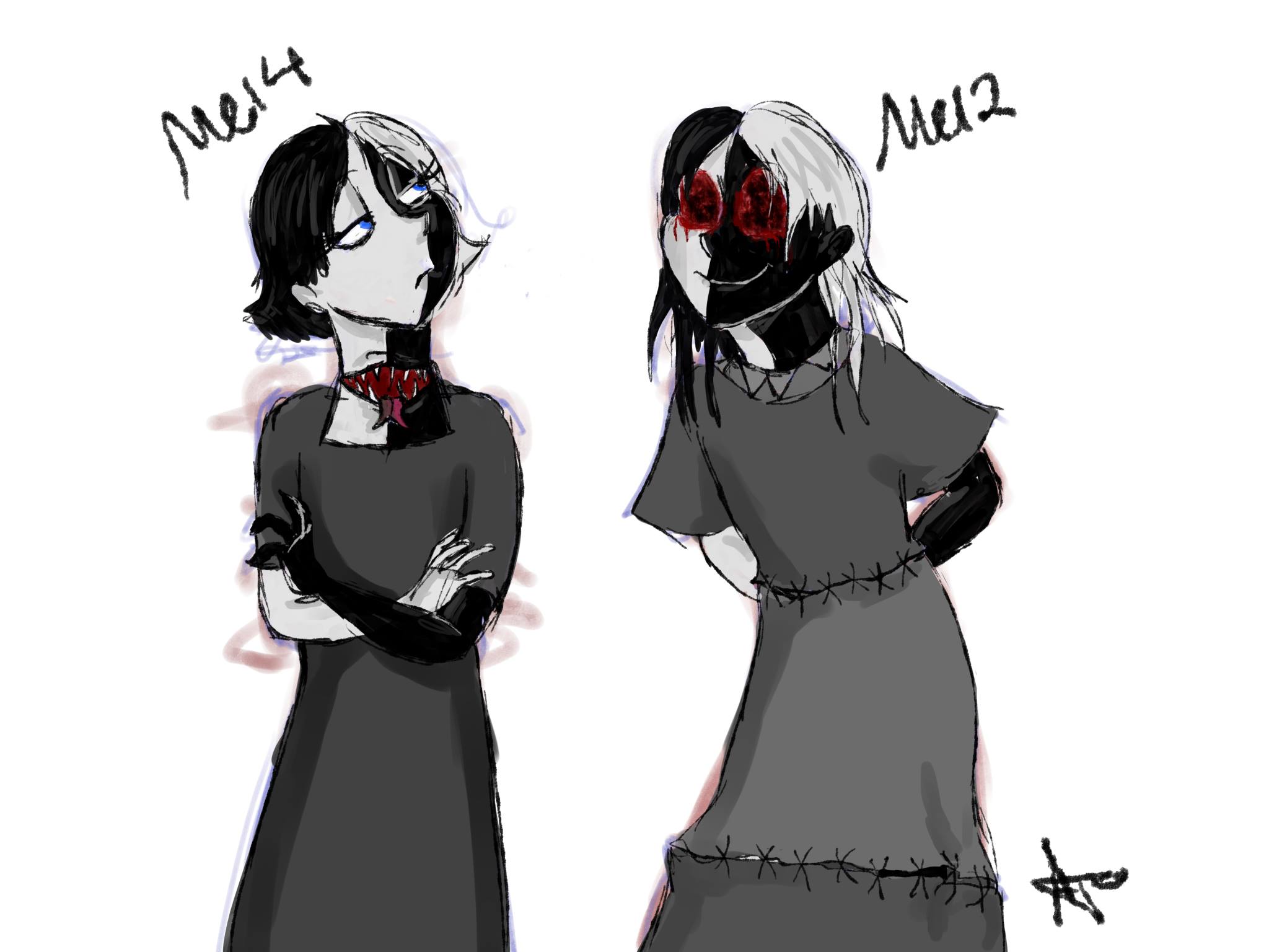 -Clingy. Physically clingy. Meli and OrigiMel are purposely designed as opposites (fucking DUH) and one of the things I've played with between them is physical contact-- OrigiMel had a thing where she hated hated HATED being touched (does anyone even remember that anymore? it was like 4 years ago lmao) and Meli now is very, VERY snuggly with her family&friends. That's a deliberate balance. So there's a whole bunch of Melinoes who are either aloof or clingy, and of course the creepy bleeding eyeless one is a snuggler
