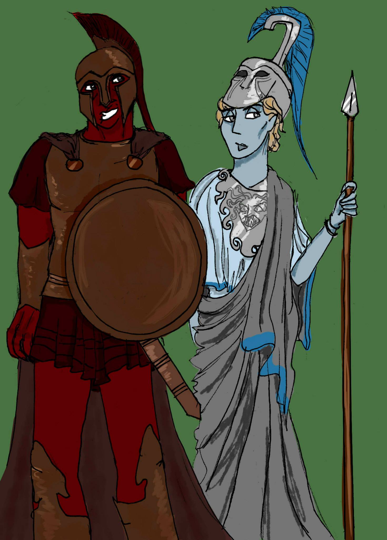 So yes, Ares is in red, and that's Athena there in blues. For anyone that doesn't know: Ares was the Greek god of war and crazy things like masculinity and bloodlust. Athena was his direct counterpart, his half-sister and godDESS of war, as well as wisdom, arts and crafts, and a few other things. Though generally represented as the calmer rational side to Ares' violence, Athena had a nasty temper and is responsible for turning Medusa into the monster everyone knows her for.