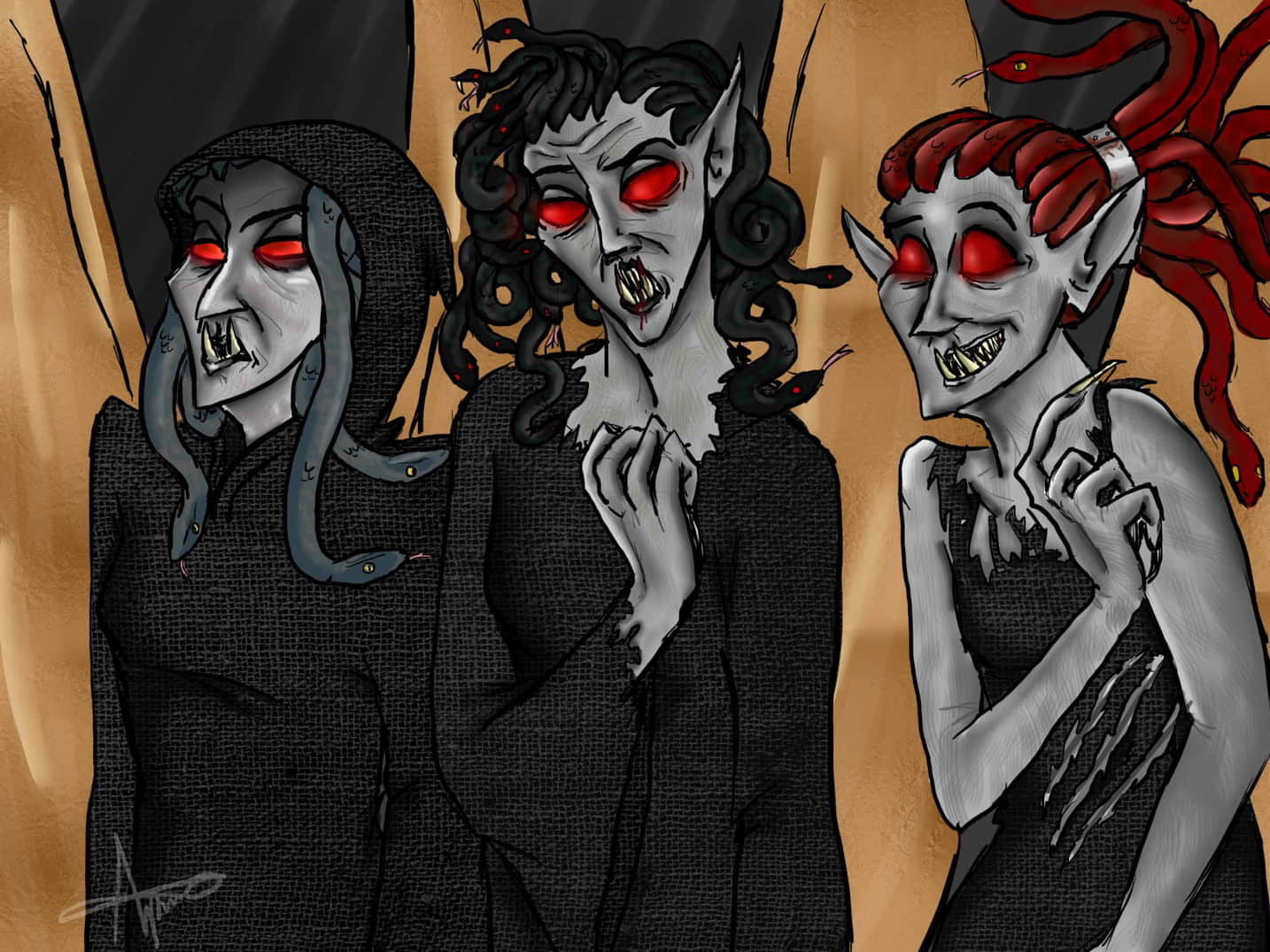 In Greek mythology, the Furies were three daemon sisters. They look really scary, and they are really scary, but most people don't have to worry about them-- the Furies were actually the good guys. Their job was to punish people who had committed terrible crimes (usually things like matricide and patricide), people who had broken Stygian oaths, or people who just pissed the gods off. From left to right; Tisiphone, Megaera, and Alecto.