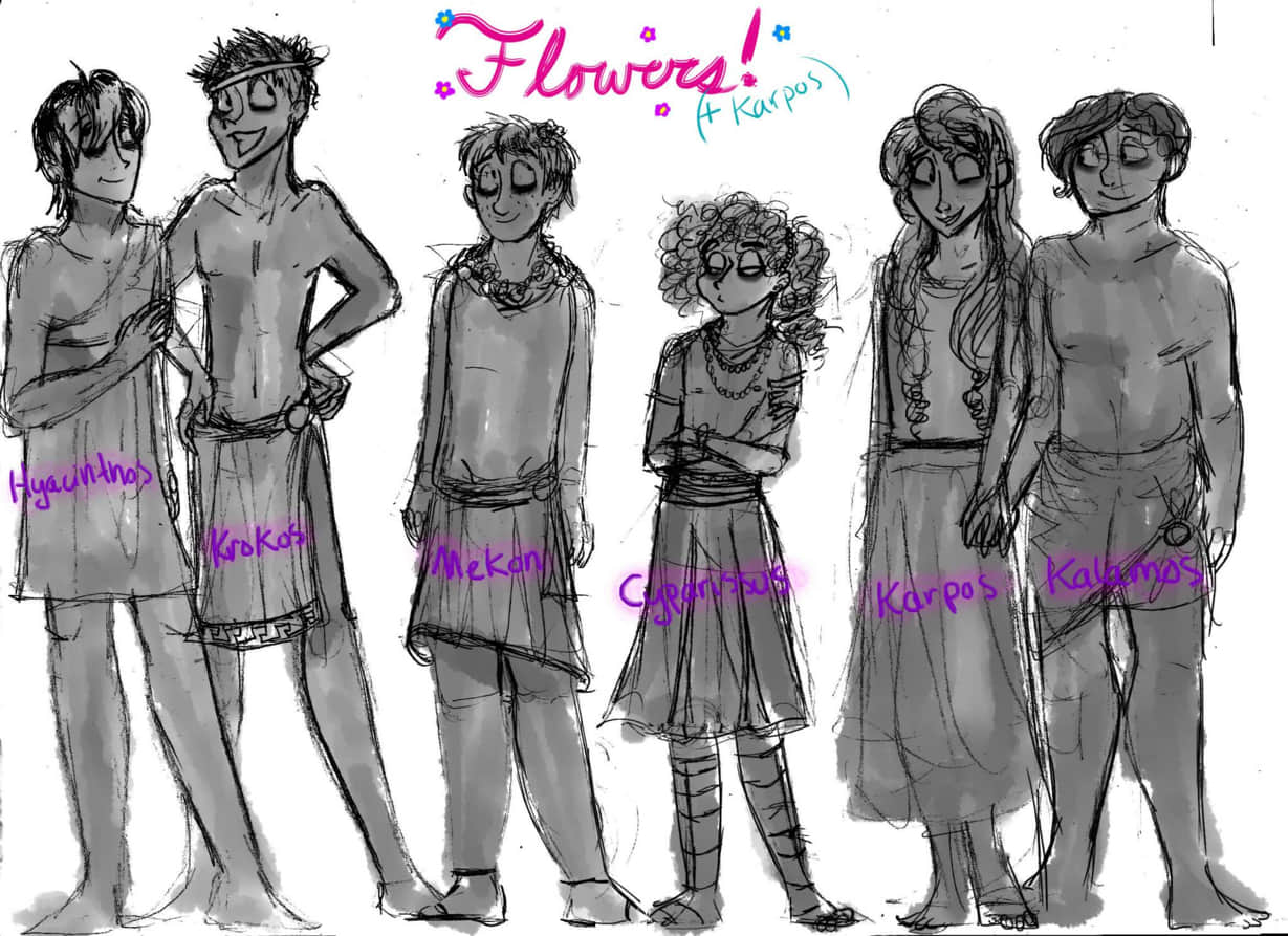 Drew some of the flower boys (+ Karpos), at least the ones that I've claimed as mine over the past few days. Oh, and Hyacinthos is in there too, he's not mine but I designed him so he gets to pose with everyone else. The flowers, to sum it all up, are mortals, usually lovers of the gods, who were turned into plants/flowers when they died. Because of their relationships with whichever gods, they all get sent to Elysium, where they spend the rest of eternity as gardeners. All together, serving under the Underworld's head gardner, Ascalaphus.
