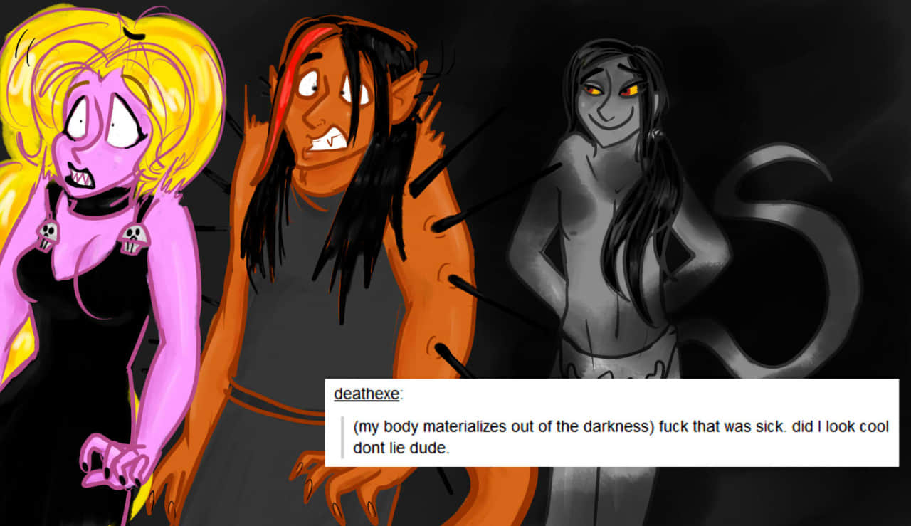 i realized yesterday that i have all these text posts tagged according to our OCs and like???? what better thing to do with them then these dumB THINGS?????? SCREECHES. there will be so many more of these omfg