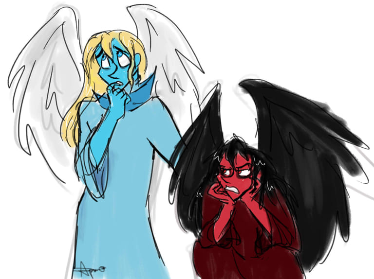 i've talked about it a lot before but if anyone doesnt know, the ADAU, or more accurately, the A/DAU- stands for Angel/Demon Alternative Universe, which is exactly what it sounds like; some of our dumbass characters dumped in an AU where some of them (Maci) are demons and others (Giselle) are angels. Supporting cast is basically just Loki, Tory, and Epi, though who knows, if it proves convenient for me, others may appear