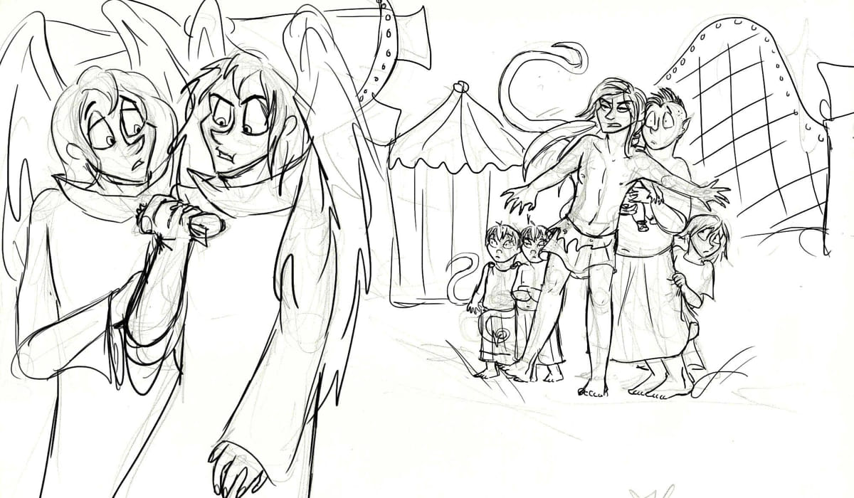 my friend gave me a drawing request which went as follows "Draw Thanatos and Hypnos at a fair and Thanatos is eating disgusting fair food. omg better yet draw Eury and Epi taking the kids to the fair too"